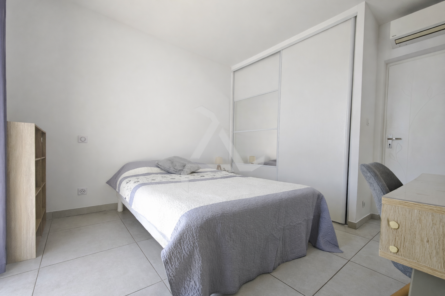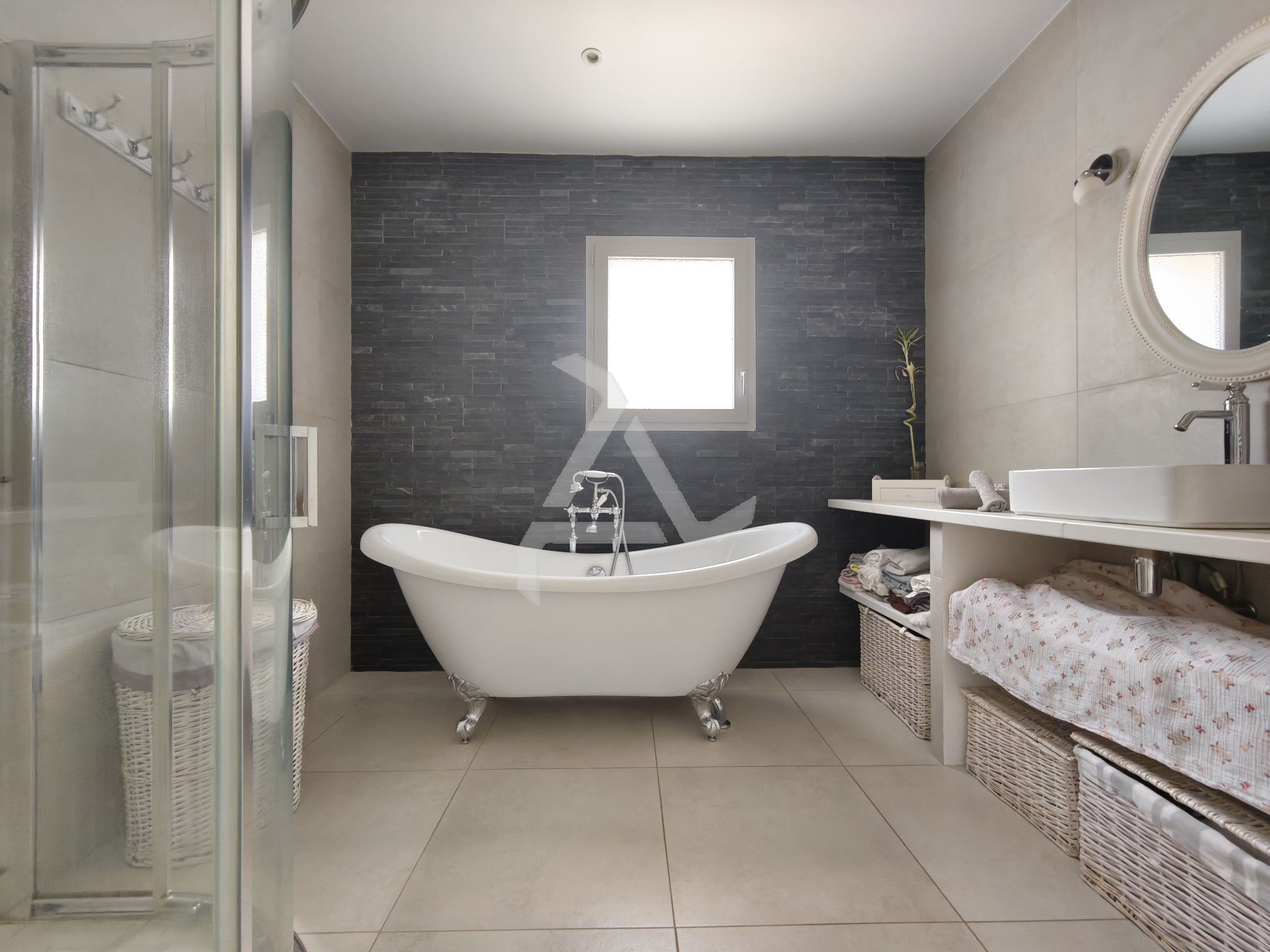 CASA CHA Immobilier® Porto-Vecchio, partner of the Interkab network, offers you EXCLUSIVELY, presents this property located just 8 minutes from Porto-Vecchio. Set on a beautifully landscaped and private 600 m² plot, this fully air-conditioned single-storey villa offers a comfortable and elegant living environment. The main house features two bedrooms with built-in wardrobes and dressing space, an office with storage, a stylish bathroom/shower room, and a modern, fully furnished and equipped open-plan kitchen opening onto a bright living and dining area. This space is extended by a sliding pocket glass door leading to a spacious terrace and a swimming pool of just under 10 m².